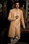 Featuring a peach sherwani in raw silk, silk and cotton base. It is paired with a kurta, pants and a stole. Style it with beaded mala and mojris for a wedding or engagement ceremony.