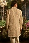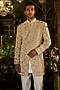 Featuring a pearl champagne sherwani in raw silk base with pearl embroidery. It is paired with a tissue silk kurta, footwear and straight pants. Style it with mojaris for a reception, sangeet, wedding or engagement ceremony.