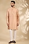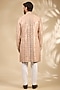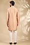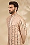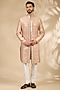 Featuring a pink sherwani in raw silk, cotton silk and cotton lycra base. It is paired with a kurta and pants. Style it with pair of mojaris for wedding or engagement ceremonies.