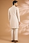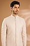 Featuring a pink sherwani in silk base. It is paired with pants. Style it with mojaris, safa and malas for a wedding or engagement ceremony, exuding charm and elegance.