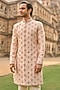 Featuring a powder peach sherwani in raw silk base with sequins, beads and thread embroidery. It is paired with a kurta, pants, footwear and an organza dupatta. Style it with pair of mojaris for a wedding or engagement ceremony.