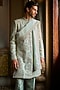 Featuring a sage green sherwani in raw silk base with sequins, bead and dori embroidery. It is paired with a silk kurta and straight trousers. Style it with pair of mojaris for a wedding or engagement ceremony.