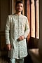 Featuring a sage green sherwani in raw silk base with sequins, bead and dori embroidery. It is paired with a silk kurta, straight trousers, footwear and an organza dupatta. Style it with pair of mojaris for a wedding or engagement ceremony.