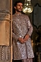 Featuring a stone grey sherwani in raw silk base with mirror work. It is paired with a silk kurta and cotton silk straight trousers. Style it with pair of mojaris for a wedding or engagement ceremony.