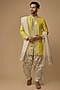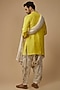 Featuring a yellow kurta in silk base with gota embroidery. It is paired with a dhoti and an embroidered dupatta. Perfect wear for festive occasions.