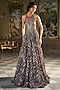 Featuring a metallic silver gown in net base with a halter neckline, criss-cross back, applique and crystal embroidery in 3D dimensional pattern. Style this designer gown with zircon dangler earrings, an embellished clutch and strappy heels, perfect for a evening soirees, red-carpet or high fashion events.