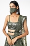Featuring an olive green lehenga in net base with motifs and sequins embroidery. It is paired with a matching embroidered blouse and a dupatta.