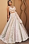 Featuring a pastel multi colored lehenga in net base with silver metallic sequins, crystal, and pearl embroidery. It is paired with a matching dupatta and a blouse.