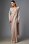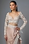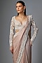 Featuring a peach saree in chiffon base. It is paired with a blouse. Style this opulent set with chandbalis and a sleek clutch for modern elegance. Perfect for glamorous sangeets, lavish receptions, and festive occasion.