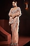Featuring a peach saree in net base with sequins embroidery. It is paired with a matching one shoulder blouse.
