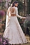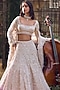 Seema Gujral features a powder peach lehenga in net base with thread, pearl and sequins embroidery in geometric pattern. It is paired with a blouse having a beads detail at the neckline and an embroidered dupatta. Style this designer lehenga with an emerald kundan polki jewellery, a floral hairdo and embellished block heels for a wedding or engagement ceremony.