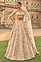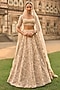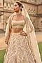 Seema Gujral presents a stunning powder peach lehenga set crafted in raw silk, adorned with intricate dori work, pearls, bugle beads, and sequin embroidery. This eye-catching ensemble features an embroidered backless blouse with crystal tassel detailing, paired with a delicate net dupatta. Accentuate the look with statement jewellery and heels for weddings, engagements, or sangeet ceremonies.