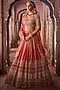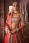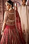 Seema Gujral presents a royal red lehenga in raw silk base with zardosi, pearl, and sequin embroidery. It is paired with an embroidered blouse featuring a broad neckline and tassel detailing at the sleeves and waist, including a net dupatta. Style this luxurious red lehenga with layered polki or uncut diamond jewellery, a sleek bun, and minimal makeup to let the intricate craftsmanship shine, perfect for a majestic wedding phera look.