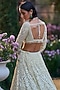 Seema Gujral features a sage green lehenga in net base with sequins, beads and crystal embroidery. It is paired with an embroidered blouse and an embroidered dupatta having tassels detail. Style this designer lehenga with an emerald kundan polki jewellery, a floral hairdo and embellished block heels for a wedding or engagement ceremony.