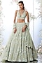 Featuring a tea green lehenga in net base with floral sequins motifs, pearls, and crystals embroidery. It is paired with a matching blouse and a dupatta.