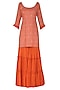 Featuring an organe short kurta in cotton base with motifs scattered all over. It comes along with a contrast powder blue block print dupatta and a sharara style pants with gathered ruffle details.