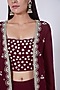 Featuring a beetroot wine jacket in pure georgette base with aari embellishments and frills. It is paired with a matching cami top and pleated pants.