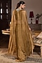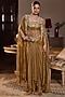 Featuring a dark gold cape in tissue base with embellishments. It is paired with a blouse having tassels embellishments and a skirt. Style this set it with polki stud earrings, a sleek bun and a clutch bag for a wedding, engagement, sangeet or cocktail ceremonies.