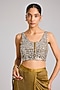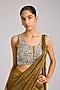 Featuring a dark gold pre-stitched saree in tissue base with embellishments. It is paired with an embellished choli. Accentuate it with zircon jewellery, heels and a clutch for a sangeet or cocktail ceremony.