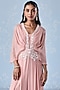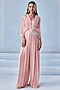 Seema Thukral presents an exquisite dusty pink pleated jumpsuit crafted in georgette base, adorned with delicate embellishments that lend a soft, ethereal charm. Style it with pearl earrings, soft curls, and sleek stilettos for an elegant look at festive celebrations, sangeet nights, or pre-wedding ceremonies.