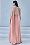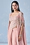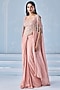Seema Thukral presents an exquisite dusty pink pre-stitched saree crafted in georgette base that lend a soft, ethereal charm. It is paired with a georgette embellished blouse and an organza cape, creating a graceful and contemporary silhouette. Style it with pearl earrings, soft curls, and sleek stilettos for an elegant look at engagement, sangeet nights, or pre-wedding ceremonies.