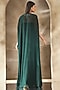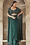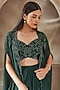 Featuring an emerald green cape in organza base with zari, beads, and pearl hand embroidery. It is paired with a matching georgette embellished choli and a draped skirt.