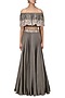 Featuring a grey off shoulder crop top in cotton with attached frill and floral hand embroidery on frill. It is paired with grey circular skirt in chanderi silk with embroidered waistband and can can underlayer.