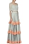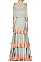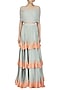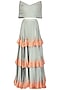 Featuring an ice blue off shoulder drape blouse in pure georgette base. It is paired with matching pleated tiered skirt in cotton silk with zardozi, thread and dabka embroidery on every panel of the skirt.