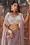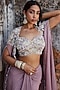 Seema Thukral features a mesmerizing Lilac Draped Skirt Set that captivates with its elegance. The eye-catching choli is crafted in georgette with sequins, pearls, glass beads, zari and floral applique hand embellishment. It comes with an organza embellished cape and a draped skirt. Accessorize the designer skirt set with dangler earrings and heels for destination weddings, showcasing style and sophistication.