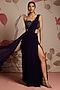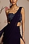 Featuring a midnight blue concept saree in georgette base with slit detail. It is paired with a hand embellished blouse. Accentuate with statement jewellery and heels for sangeet ceremonies or cocktail parties.