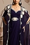Featuring a midnight blue jacket in organza base with hand embellishment. It is paired with a georgette dhoti style draped saree and a belt. Accentuate with statement jewellery and heels for sangeet ceremonies.