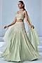 Seema Thukral presents an exquisite mint green embellished lehenga crafted in an georgette and chiffon base, including a can-can that lend a soft, ethereal charm. It is paired with an embellished blouse having an attached dupatta, creating a graceful and contemporary silhouette. Style it with pearl earrings, soft curls, and sleek stilettos for an elegant look at festive celebrations, sangeet nights, or pre-wedding ceremonies.