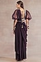 Featuring an old burgundy blouse in georgette base with patch work, glass beads, crystals, and sequins hand embroidery including puff sleeves. It is paired with matching pleated pants and a pre stitched pallu in chiffon base.