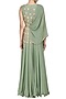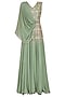 Featuring an olive green flared gown in pure georgette base with chitta and sequins work embroidery on front and back bodice highlighted with beads and pearls along with drape cape attached through one shoulder.