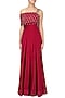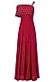 Featuring a red off shoulder full length gown in pure georgette with an attached panel and shoulder strap. It has shoulder strap embellished with pearl tassels and finished with a cotton silk border at the bottom.