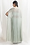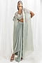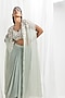 Featuring a sage green cape in organza base with glass beads, pearl, sequins and floral applique hand-embellishments. It is paired with matching georgette embellished choli and a draped skirt. The set includes three pieces.