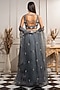 Featuring a blue circular skirt in organza base with glass beads and pearls hand embroidery. It is paired with a matching blouse and an organza cape jacket.