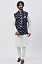 Featuring a navy blue bundi jacket in silk base with zardosi embroidered buttons and floral print. It is paired with a contrasting beige cotton silk pocket square. Perfect for any festive occasion or any other special events, it ensures a stylish look.