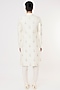 Featuring an off-white sherwani in silk base with motifs hand embroidery. It is paired with matching cotton churidar pants and mojris.