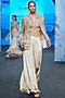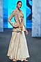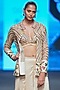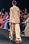 Featuring a beige jacket in ajrakh, gajji silk, organza and german satin base with embellishments. It is paired with a matching bralette and flared pants.