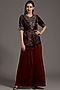 Featuring a maroon and black coat top in pure mashru silk base with ajrakh print, including a zardosi and nakshi embroidered yoke. It is paired with matching crepe pleated pants.