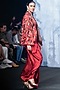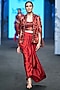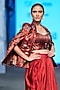 Featuring a maroon blouse in ajrakh, gajji silk and german satin base with embellishments. It is paired with a matching embellished jacket and a draped skirt.