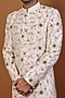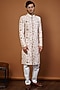 Featuring a light pink sherwani in silk base with dabka hand embroidery. It is paired with a matching kurta and contrasting white pyjama pants.
