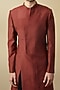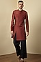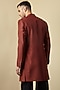 Featuring a maroon panelled achkan kurta in silk base. It is paired with contrasting black pants having wide hem.