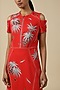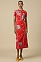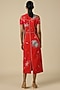 Featuring a red cold shoulder midi dress in double crepe base with leaf and fruit embroidery.