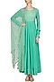 This set features an aqua flared kalidaar anarkali kurta in georgette base with gold floral sequins embroidered striped panels on the yoke. It is paired with matching aqua sequins embroidered net dupatta.