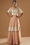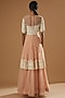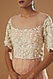 Featuring a nude layered gown in tulle base with sequins and floral applique hand embroidery.
