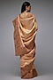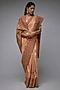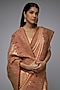 Featuring a peach kanjivaram saree in silk base with tilla embroidery. It is paired with an unstitched blouse piece. Accentuate with dangler earrings and heels for special occasions.
