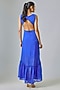 Featuring a blue high-low dress in cupro and organza base with beaded accents. Style it with statement earrings and heels for a beach dress or throw on an overlay for a layered look.
