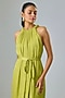 Featuring a green gathered shift midi dress in cupro and viscose base with neck straps and embellishments. It is paired with a belt. Style it with statement earrings and heels for a beach dress or throw on an overlay for a layered look.